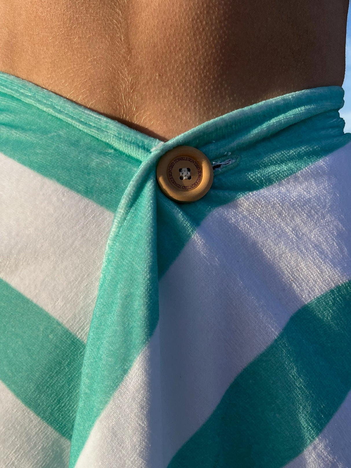 Our buttons work by wrapping the towel around yourself, either around your waist or shoulders, then finding the right size and fit for your body and gently putting the button through the hole.