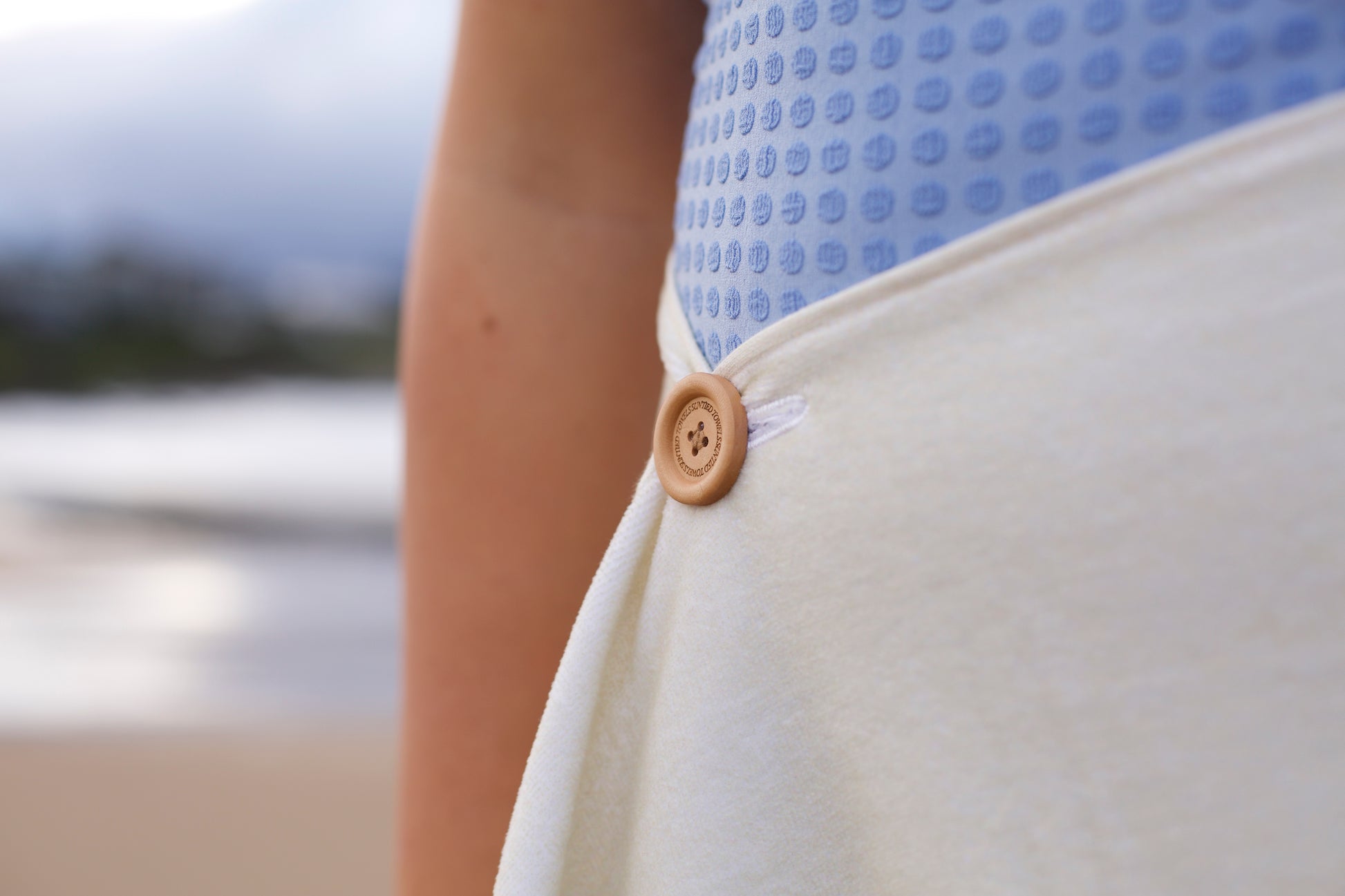 Our buttons work by wrapping the towel around yourself, either around your waist or shoulders, then finding the right size and fit for your body and gently putting the button through the hole.