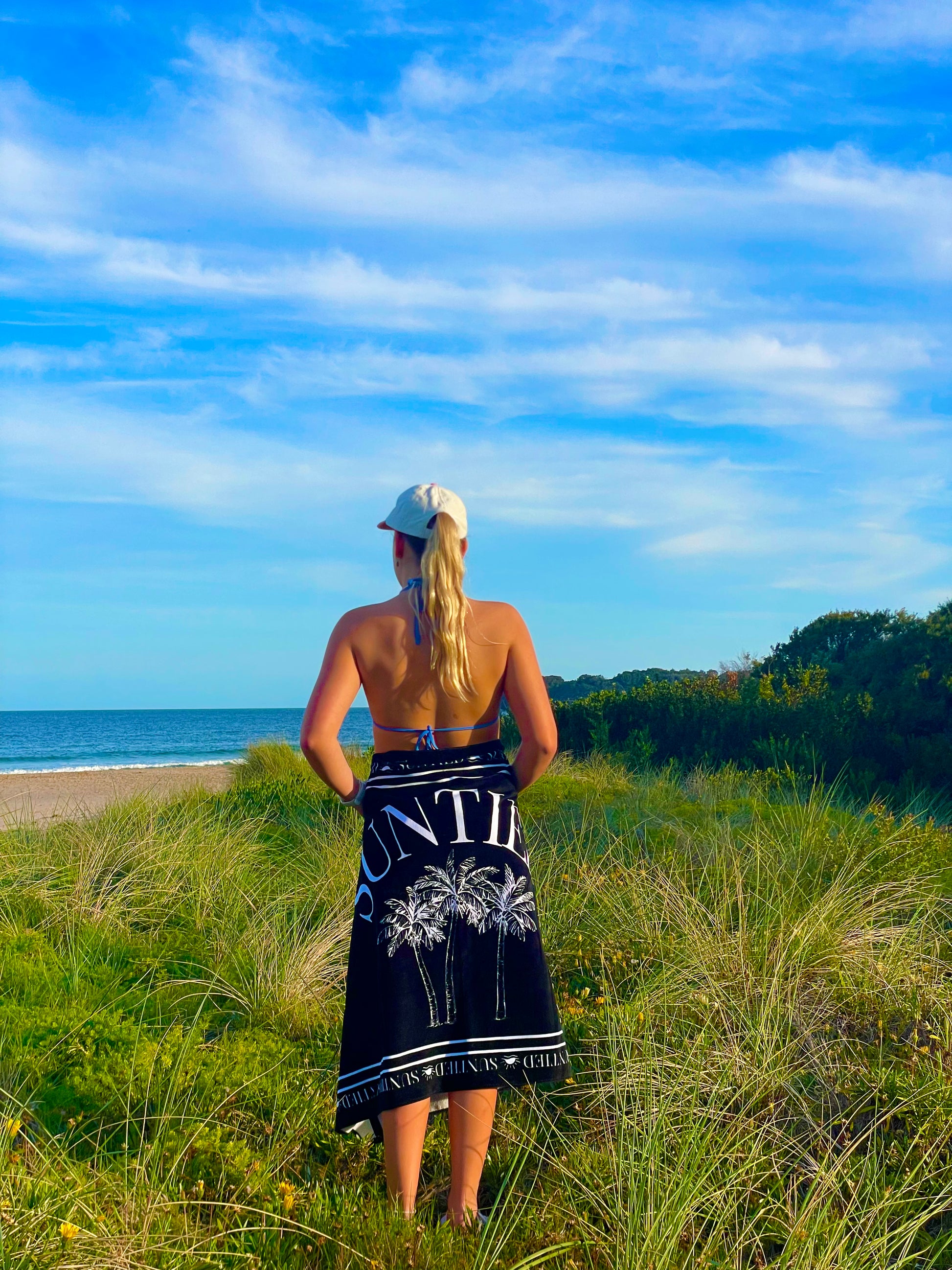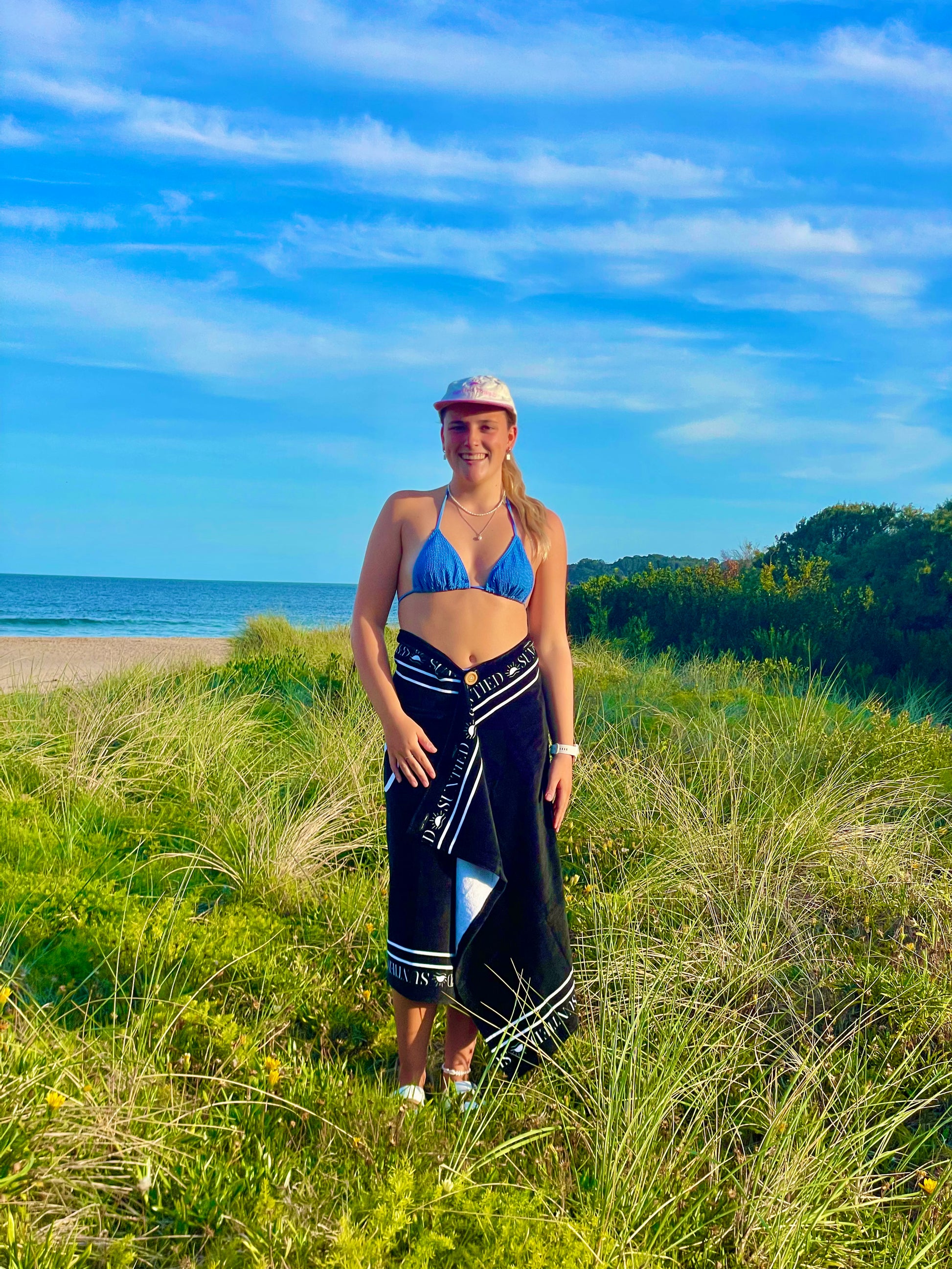 The idea began when we were walking back from the beach and we were frustrated with towels that wouldn't stay put and kept falling down. After plenty of brainstorming, we designed a towel with a simple button-and-hole system, allowing you to adjust and secure it to your liking.